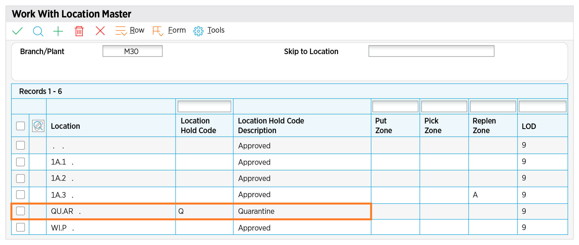 Putting an inventory location on hold is designed to streamline inventory management by allowing the hold status of a location to control the availability and movement of items within that location. This is achieved by using a Location Hold field in the Location Master (P4100), which eliminates the need to update individual item/lot/location records as below.