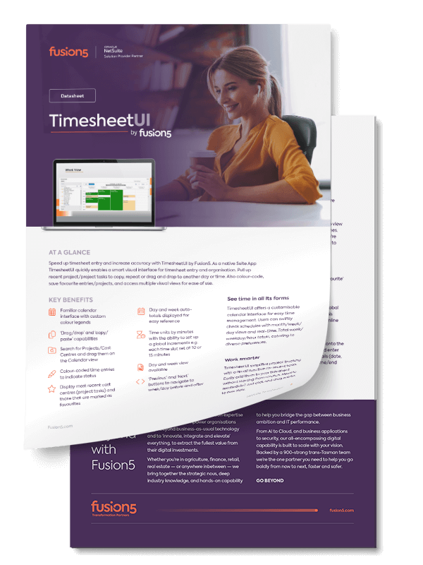 NetSuite Timesheet UI is a native SuiteApp, which means it has been built on the SuiteCloud developer platform. Native SuiteApps are developed entirely using NetSuite's development platform and can be installed as a bundle directly into your NetSuite environment. Timesheet UI is just one of many enhancements the Fusion5 NetSuite team have built for our customers.