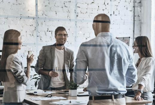 Diverse group of young business people drinking champagne and smiling while standing behind the glass wall in the board room.